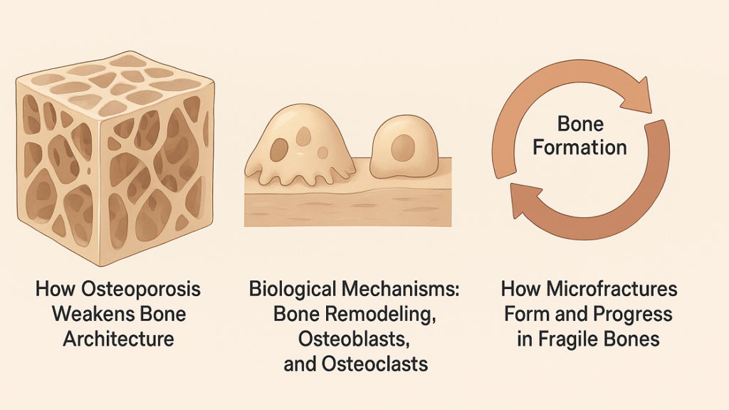 Bone is a living tissue composed of dense cortical bone and a porous inner network called trabecular bone. In osteoporosis, trabecular connections thin and break, while cortical bone loses its compact structure, leading to increased porosity and fragility. These structural weaknesses reduce the bone’s ability to absorb normal mechanical stress, causing microscopic cracks even during routine movements. Additionally, lower collagen quality and impaired mineralization diminish elasticity, further predisposing bones to injury. Over time, this deterioration alters bone geometry and mechanical performance, increasing susceptibility to collapse or vertebral compression fractures. Such progressive architectural decline underscores why bone strength cannot be measured solely by density.
