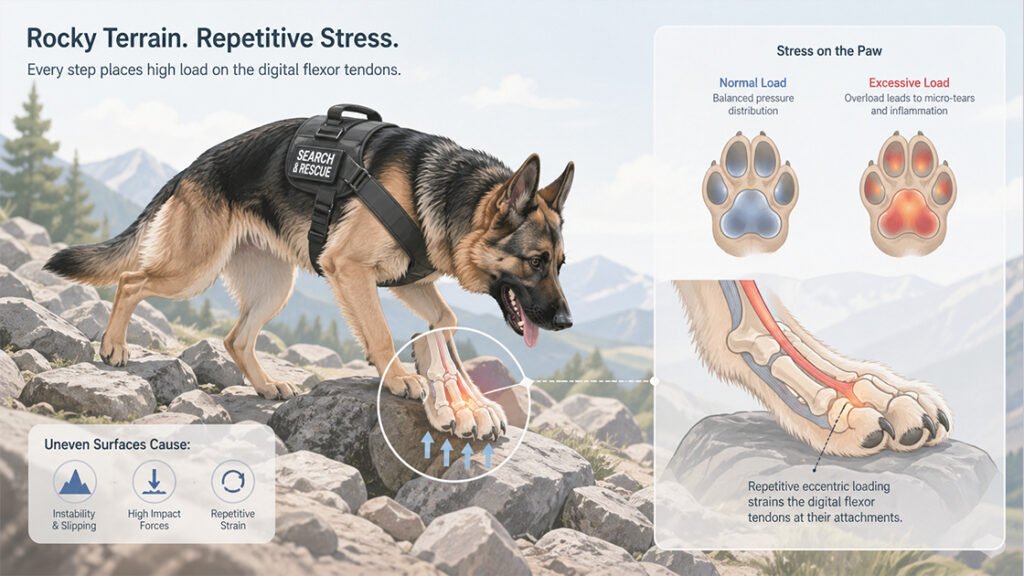 Each canine digit contains two flexor tendons—the superficial and deep digital flexors—that run from the elbow and carpus down to the toe bones. These tendons slide through synovial sheaths, allowing smooth gliding as the dog grips uneven surfaces. During a rocky terrain search, the dog constantly contracts these tendons to stabilize the paw against loose and shifting substrates. The repetitive eccentric loading strains the tendon fibers at their attachment points to the phalanges. Without adequate rest between searches, micro‑tears accumulate faster than the body can repair, leading to a classic overuse tendinopathy with inflammation, swelling, and progressive pain on weight bearing.