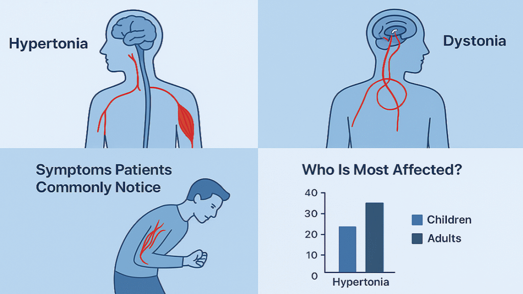 Hypertonia is a neurological condition where muscle tone is abnormally increased, leading to stiffness, rigidity, and resistance to movement. Muscles may contract involuntarily even at rest, making voluntary movements difficult and sometimes painful. This can range from affecting a single area to entire limbs, often interfering with daily activities. Patients commonly describe tightness, cramping, and difficulty relaxing muscles. Dystonia, in contrast, is marked by involuntary muscle contractions that cause twisting movements and abnormal postures. It may affect one region (like the neck or hands) or multiple muscle groups throughout the body. Unlike hypertonia’s constant stiffness, dystonia symptoms are often triggered by certain activities or positions, making them unpredictable and disabling. The underlying problem lies in the basal ganglia and related neural networks that control movement. While both conditions involve abnormal muscle activity, their patterns and triggers differ, which impacts treatment strategies.