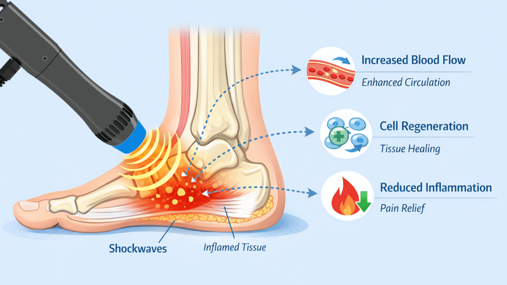 SWT increases local blood circulation, which delivers oxygen and nutrients to damaged tissues while removing metabolic waste products. The therapy also modulates inflammatory mediators, reducing swelling and accelerating recovery. These combined effects are critical for treating chronic heel pain where inflammation persists over time.