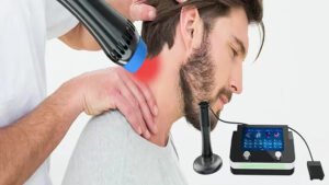 A shockwave therapy machine uses high-energy acoustic waves to stimulate healing in musculoskeletal tissues and reduce pain.